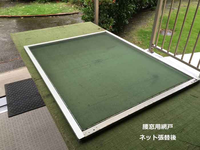 掃出し窓サイズが2枚と腰窓サイズが2枚の計4枚の張替でした。今回は20メッシュでグレー色の防虫ネットを使用しました。